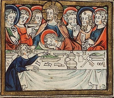 21 After saying this Jesus was troubled in spirit, and declared, ‘Very truly, I tell you, one of you will betray me.’ 22The disciples looked at one another, uncertain of whom he was speaking. 23One of his disciples—the one whom Jesus loved—was reclining next to him; 24Simon Peter therefore motioned to him to ask Jesus of whom he was speaking. 25So while reclining next to Jesus, he asked him, ‘Lord, who is it?’ 26Jesus answered, ‘It is the one to whom I give this piece of bread when I have dipped it in the dish.’ So when he had dipped the piece of bread, he gave it to Judas son of Simon Iscariot. 27After he received the piece of bread, Satan entered into him. Jesus said to him, ‘Do quickly what you are going to do.’ 28Now no one at the table knew why he said this to him. 29Some thought that, because Judas had the common purse, Jesus was telling him, ‘Buy what we need for the festival’; or, that he should give something to the poor. 30So, after receiving the piece of bread, he immediately went out. And it was night. (John 13.21-30, NRSV)